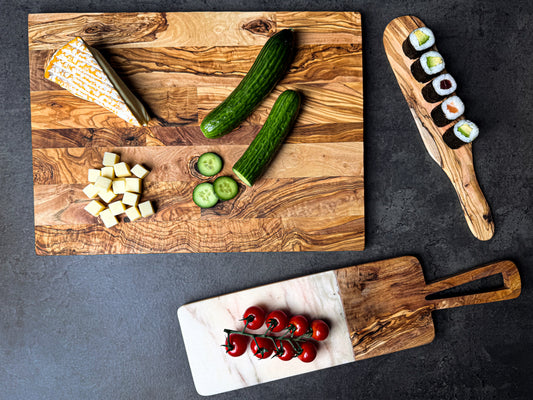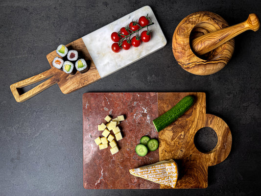 Entdecke unsere einzigartigen Schneidebretter aus Olivenbaumholz, die Nachhaltigkeit mit zeitloser Eleganz verbinden. Ob aus purem Holz oder veredelt durch Modernem Marmor – jedes Stück ist ein langlebiges Unikat mit charaktervoller Maserung, perfekt für stilvolles Zubereiten und Servieren.